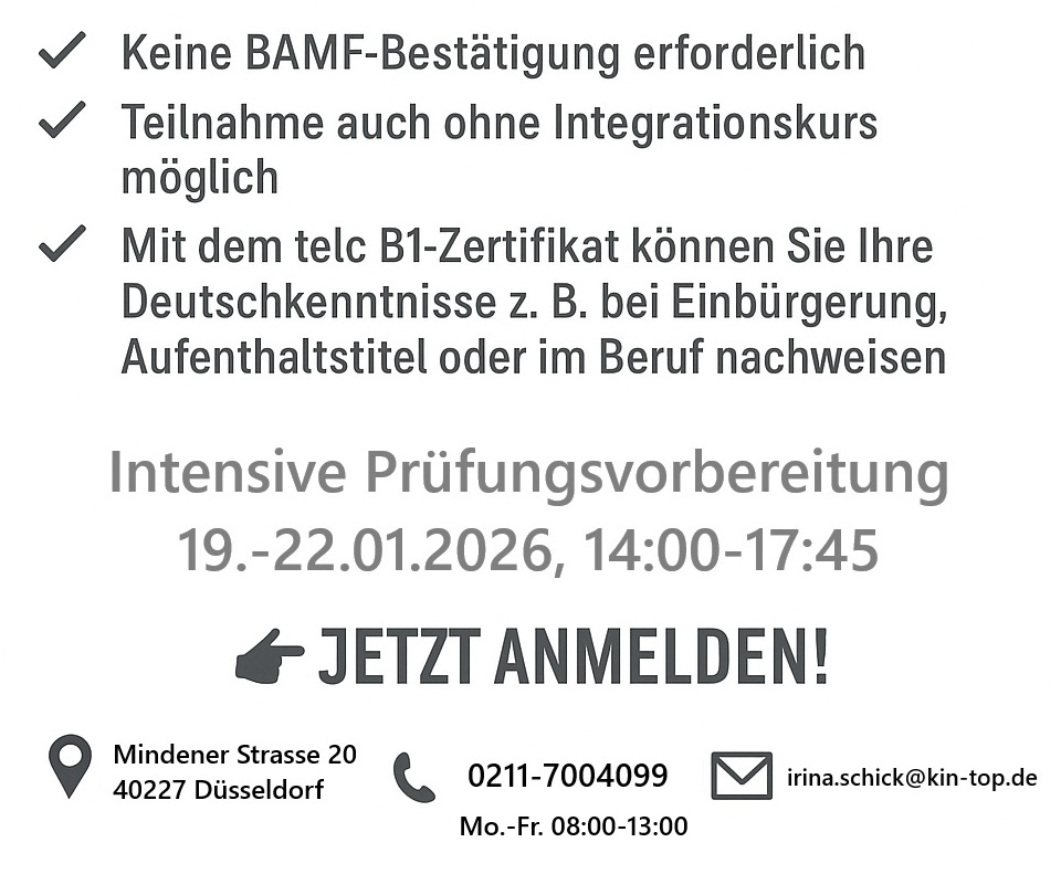 Tel. 0211 - 700 40 99, WhatsApp 0179 122 97 50 E-Mail: info@kin-top.de Dienstleistungen: Interkulturelles Zentrum, Berufsberatung, Integrationskurse, Flüchtlingsberatung, Bildungsangebote für Kinder, Lernförderung/Nachhilfe.